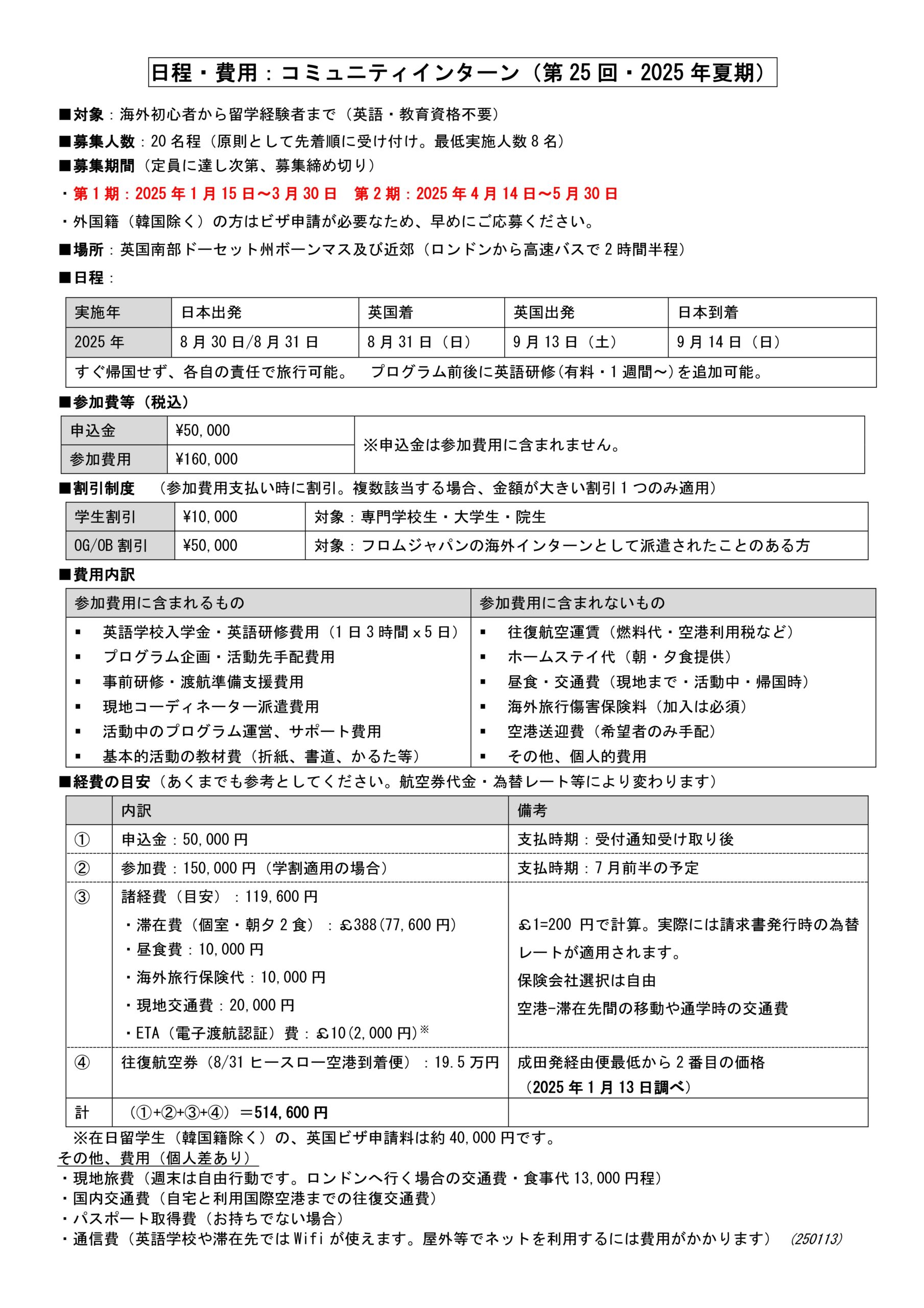 (対象:専門学校生・大学生・院生) - OG/OB割引:50,000円